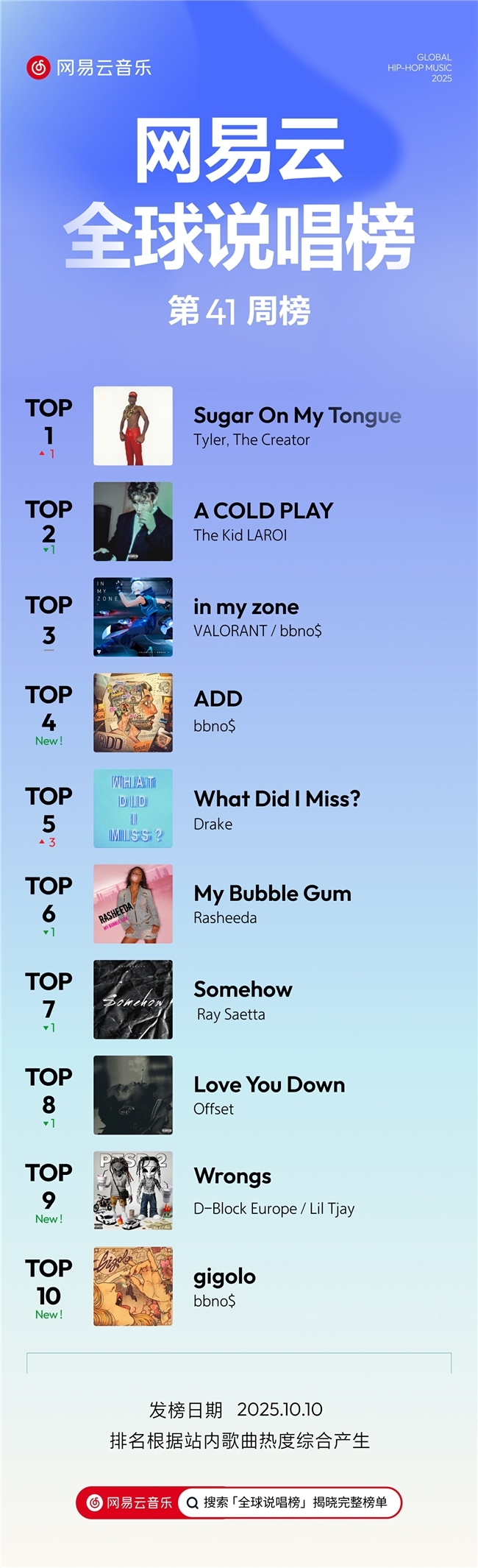 10月10日,网易云音乐发布2025年第41期说唱周榜。榜单聚焦华语及全球说唱圈层,综合平台内播放、收藏、评论等数据,每周五向用户推送当周最具热度的说唱作品,涵盖“网易云中文说唱榜”和“网易云全球说唱榜”两大类别。用户在网易云音乐搜索“说唱榜”即可查看完整榜单。