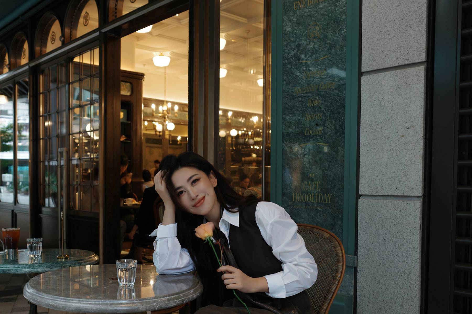 > 朱珠手拿玫瑰花笑眼动人 双手插兜帅气随性
